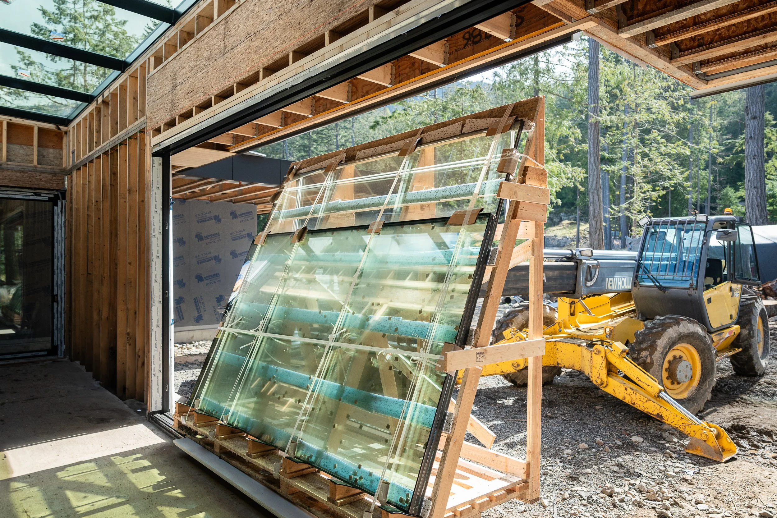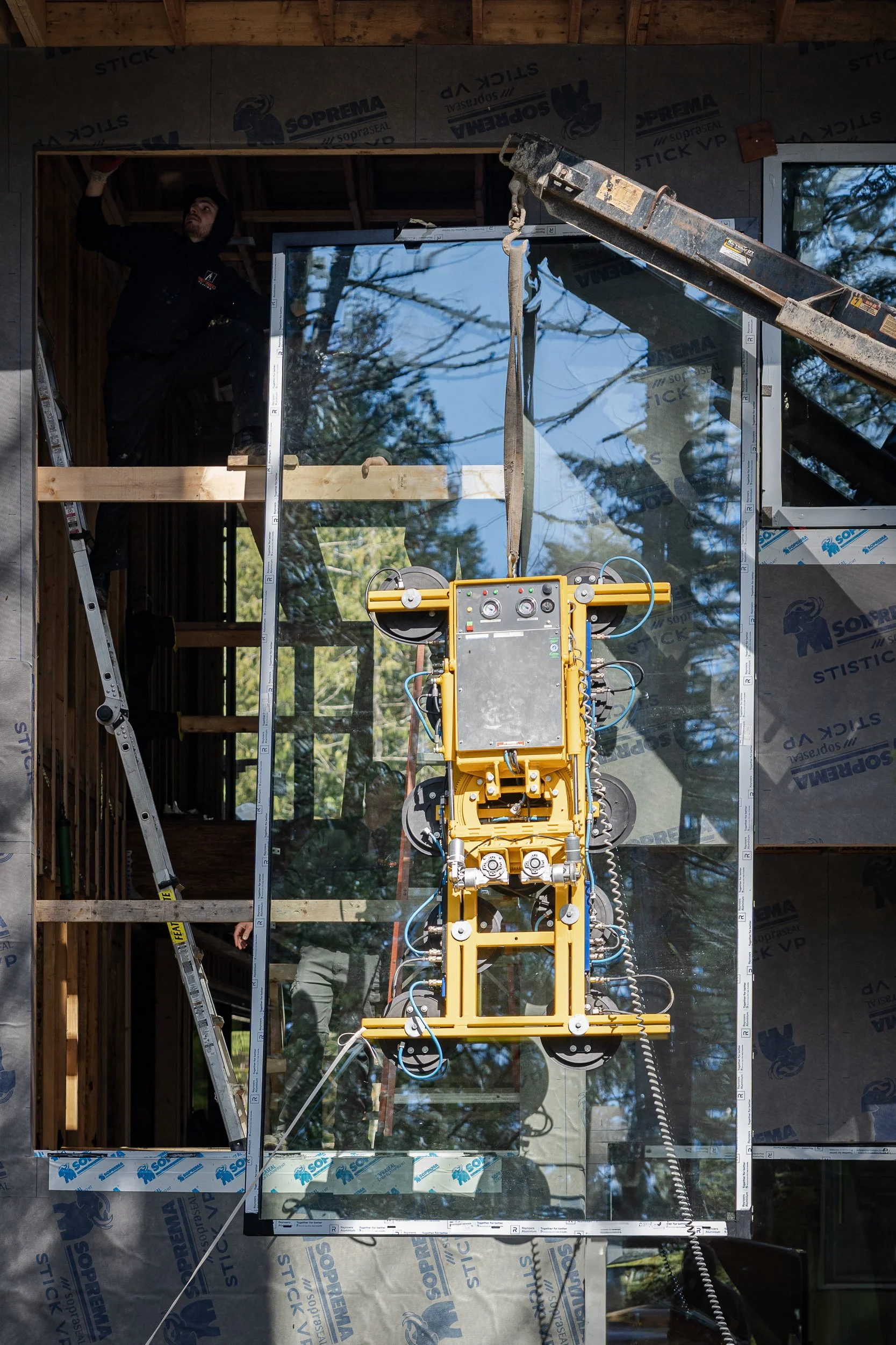 Construction workers installing a large glass window on a building with wood framing. One person is working on the interior, while the other is guiding the glass. An orange glass installation machine is positioned in front of the window.